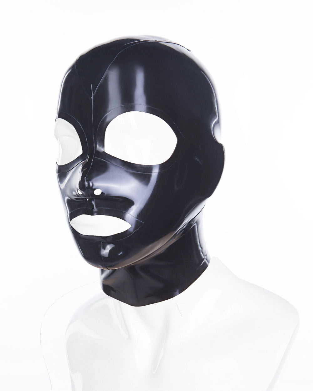 Classic latex hood with trim around the eyes and mouth, it hasnose openings for easy breathing. It fastens at the back with a zipper with guard placket to protect your skin and hair.