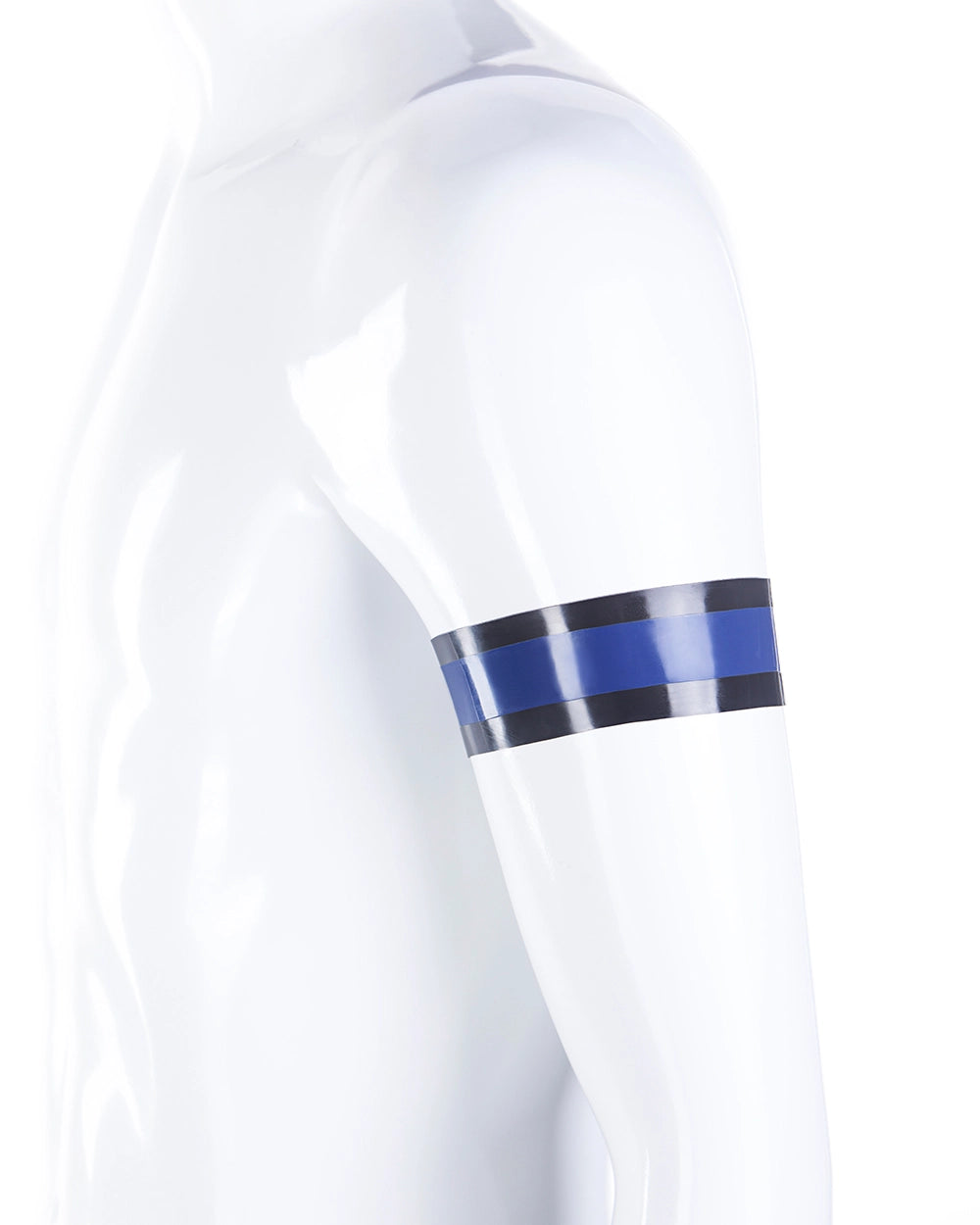 This bicep latex band has a contrast color code design is 4 centimeters/ 1,6" wide, is available in various sizes, can be ordered in various color combinations, made from thicker grade latex. Shown in black color with red contrast.