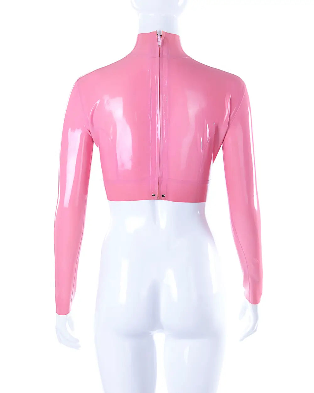 This cropped T top features long sleeves, a high neck, and a discreet zip fastening at the back, making it a stylish choice for any occasion. In the picture is shown in Bubblegum Pink.