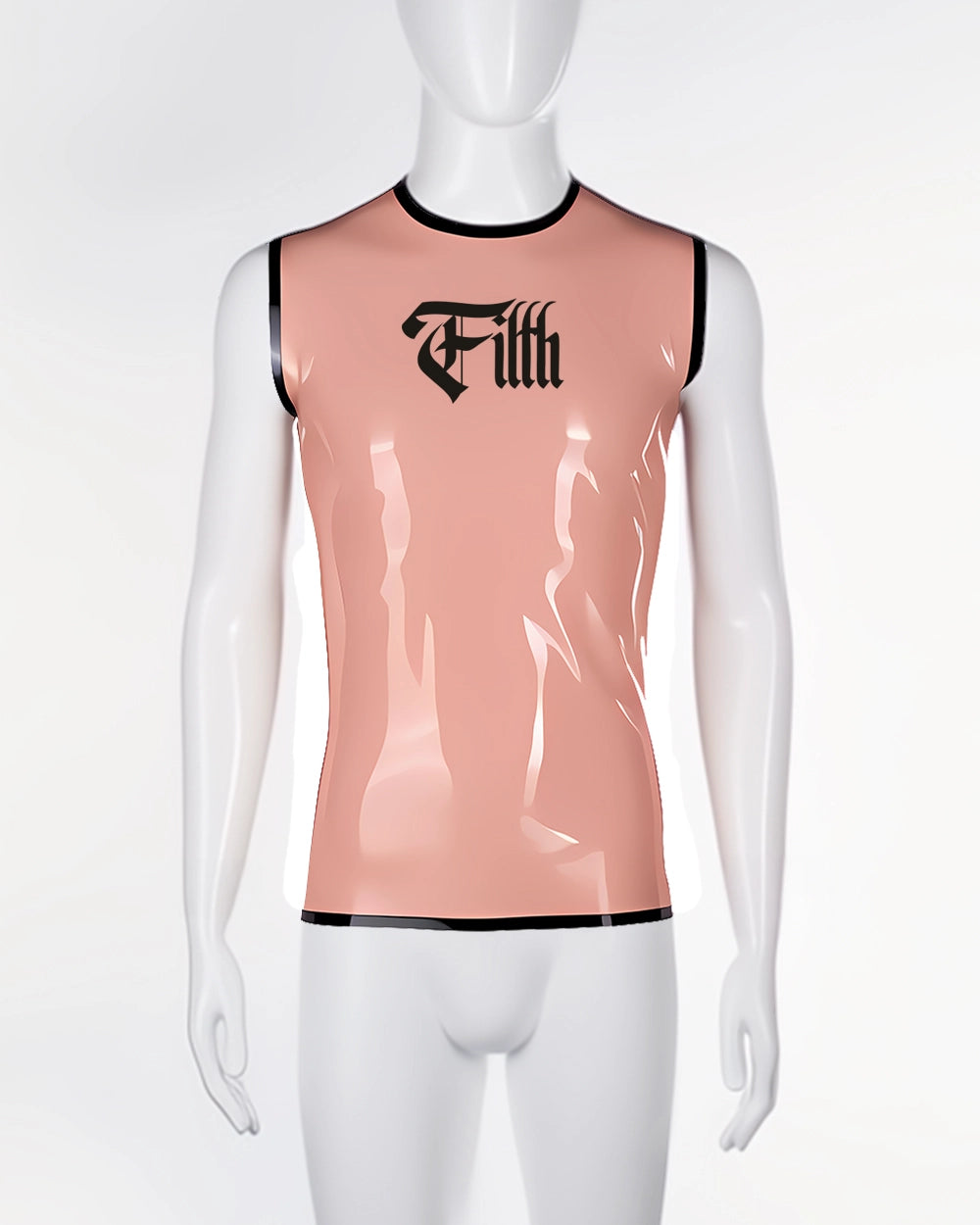 Latex sleeveless t-shirt with contrast FILTH text at front. It has a contrast trim in armholes and bottom. In the picture is shown on Semi-transparent pink color with solid black contrast.