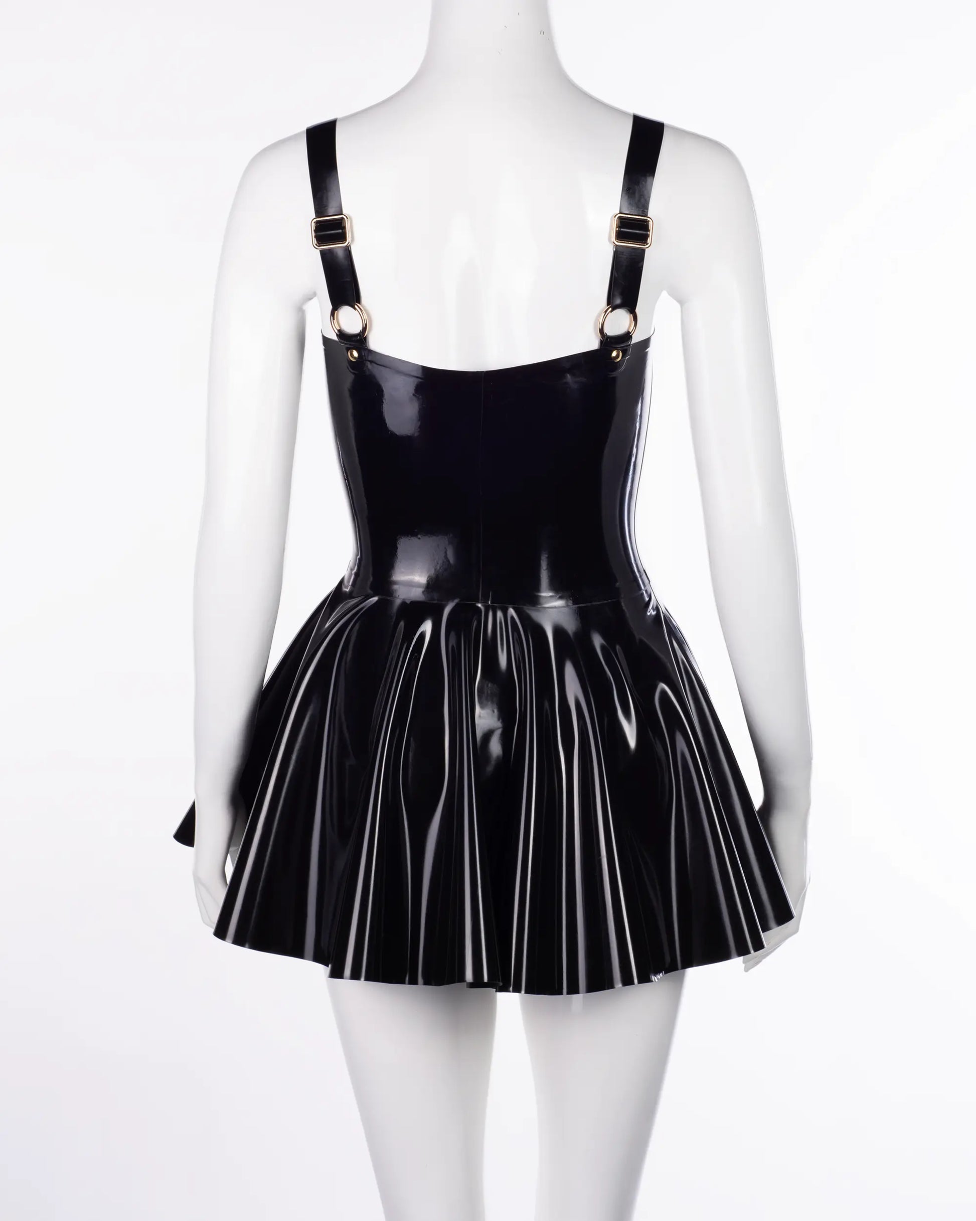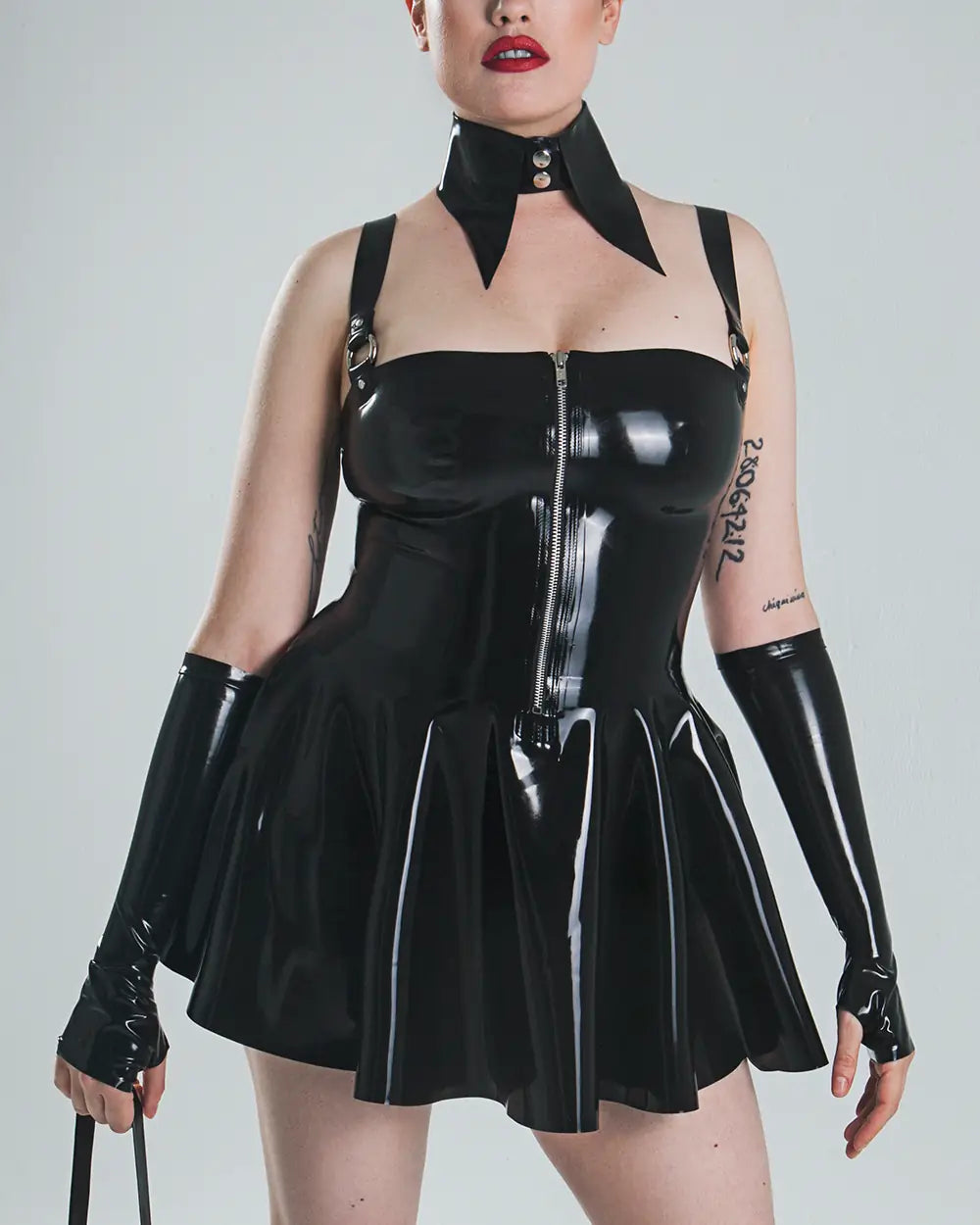 Latex dress feature a flare design, it has a metallic front zip and o-rings, you can choose the color of this details between silver or gold color.