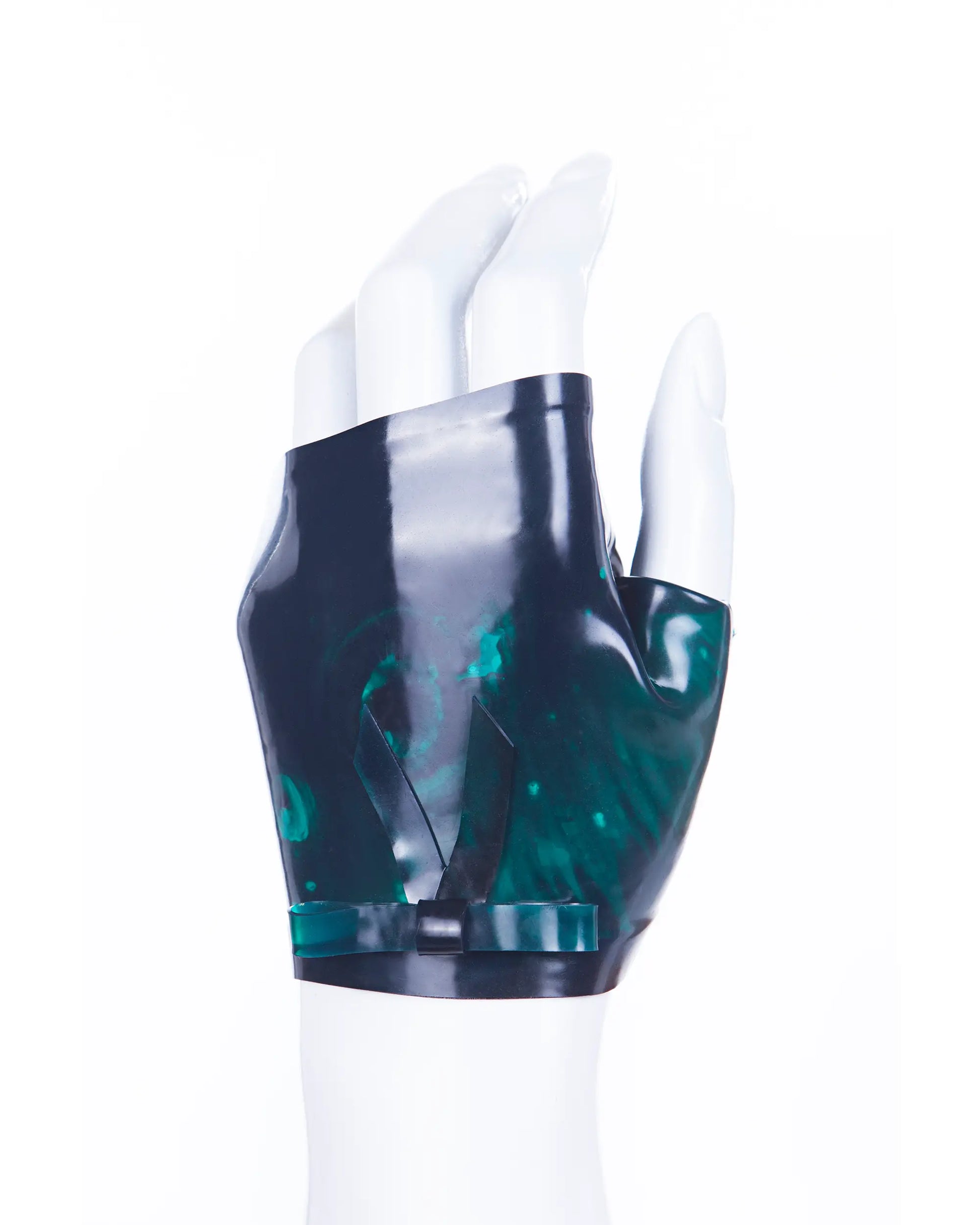 Marble fingerless latex gloves, wrap across the knuckles and have a small bow as detail at the front centre. Shown in Black & Green Marble and available in a variety of colors.