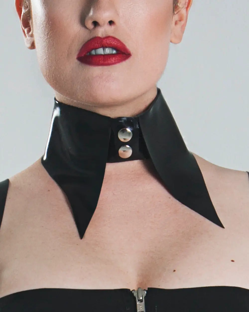 Neck collar designed like a shirt collar with a small twist, closes at the front with snaps.