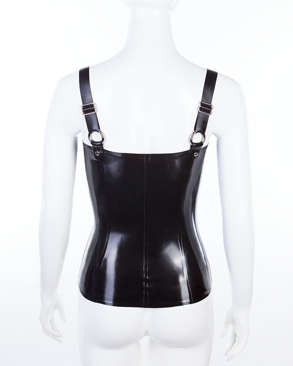 Latex top with a hip length cut, designed to offer more coverage than the Farrah crop top while maintaining the same fitted construction.