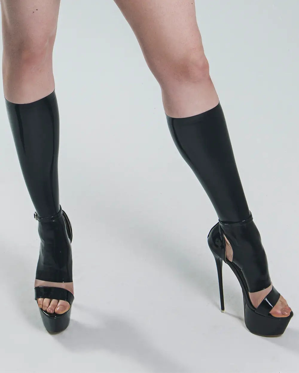 Under the knee length latex toeless socks, plain design for a classic look. Shown in black.