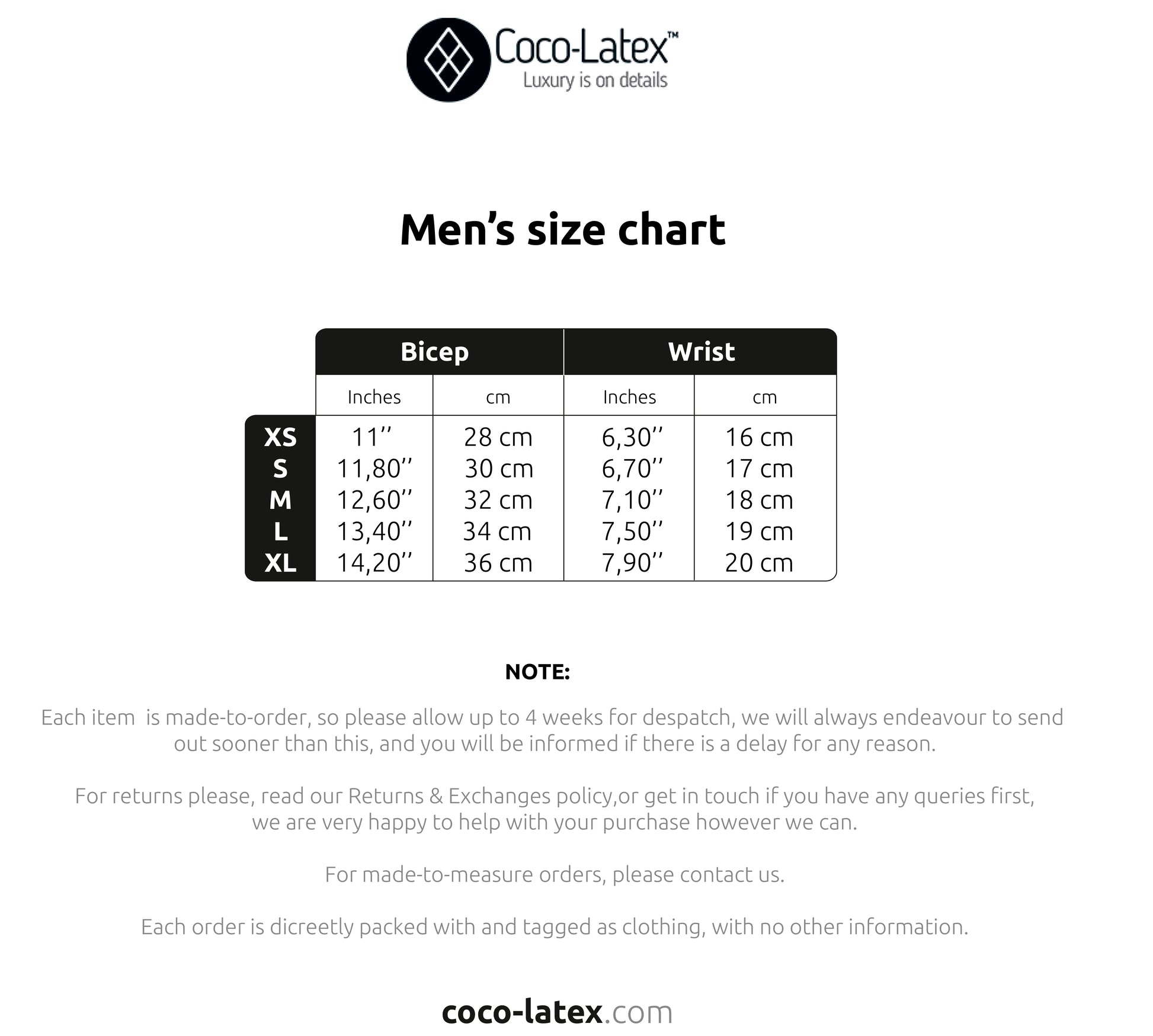 Wrist wallet, is available in various sizes, and color combinations. This item is made in thicker grade latex and closes with snaps.